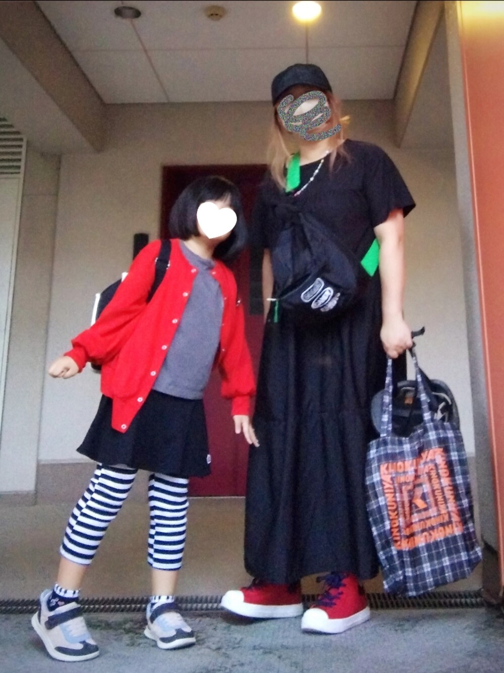 娘を習い事に送り迎え 小雨だったので雨の日仕様! 紀ノ国屋チェック柄バッグは1年ぐらい前の オトナミューズの付録のエコバッグ 中には図書館に返す本が入っています📖 以上|彡サッ