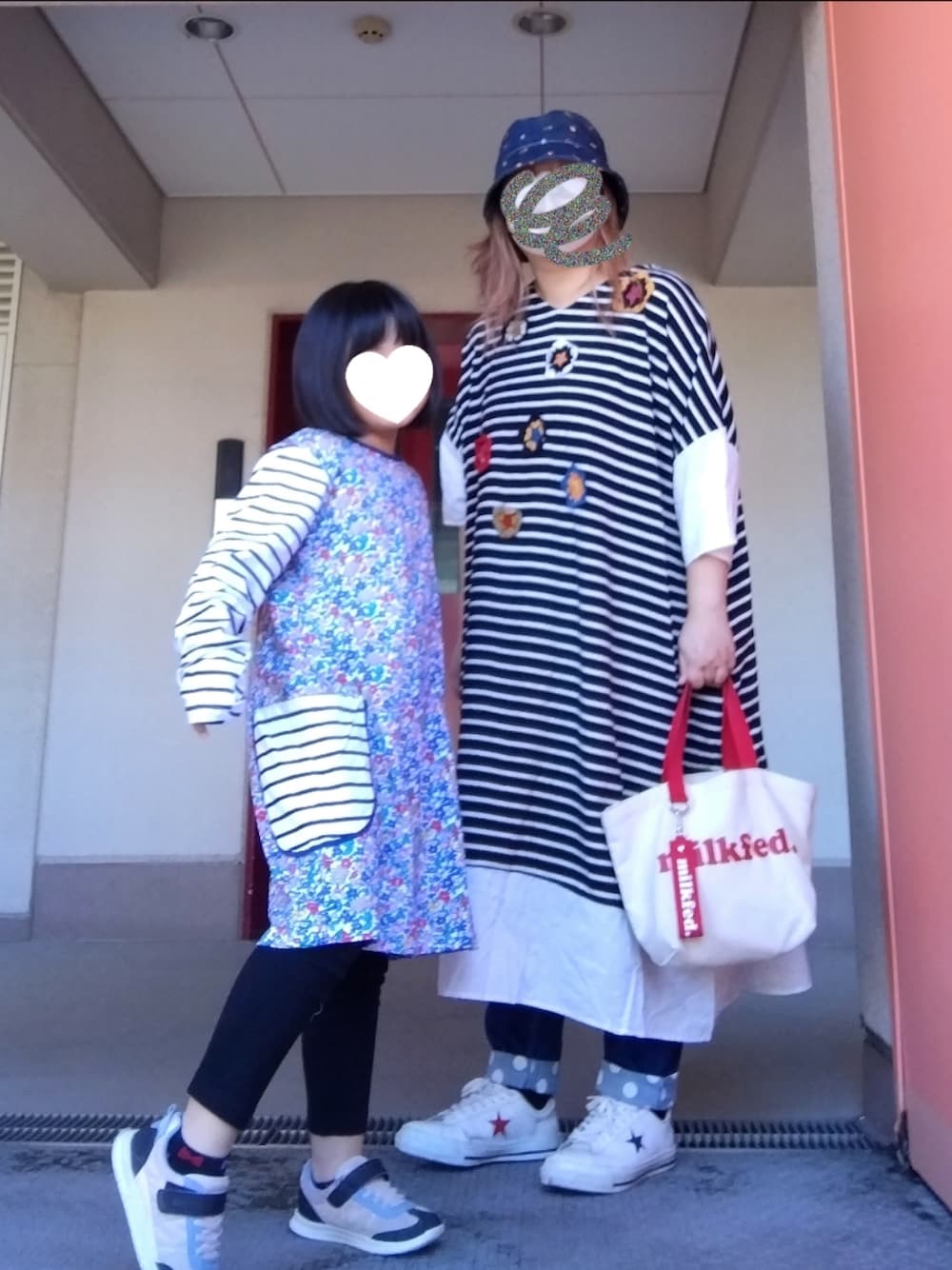 昨日のコーデです┏○ どちらのワンピもボーダー×花 娘のワンピはポケット付きなので 学校にも着ていけそう! 以上|彡サッ