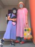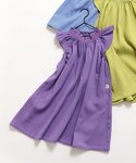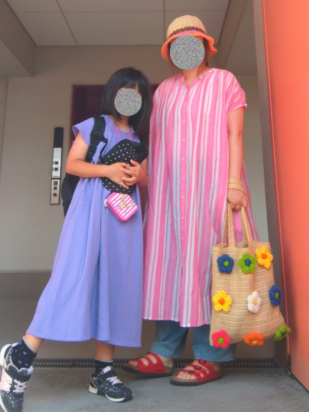 娘のワンピースは遠目だと無地に見えますが 青地に細かいピンクのボーダーで ストライプ状の編み目?のある生地になってて 実は凝ってます(゚ω゚) 本人も気に入ってて着てくるくる回ってました😂 以上|彡サッ