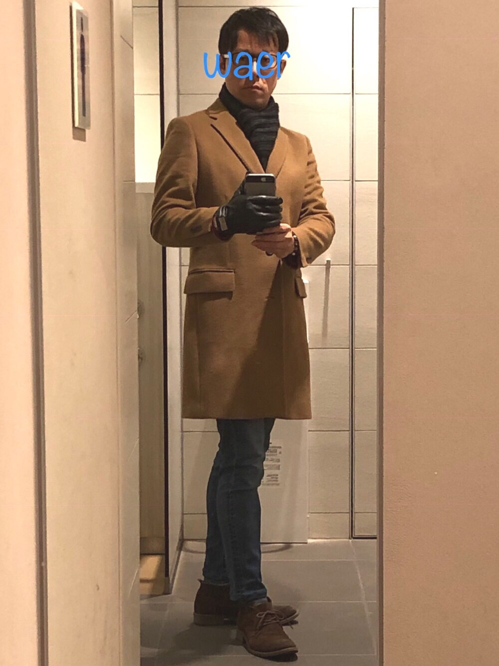 ブラウン系のチェスターコートを着用したメンズの冬コーディネートの1枚目の写真