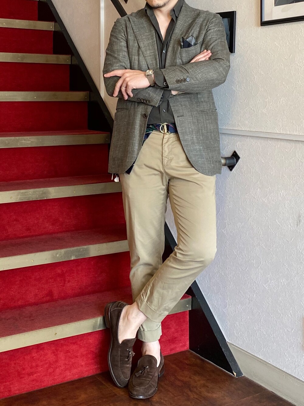 今日はグリーンなコーディネート。 人生初のネクタイ素材のリングベルトを買いました✨