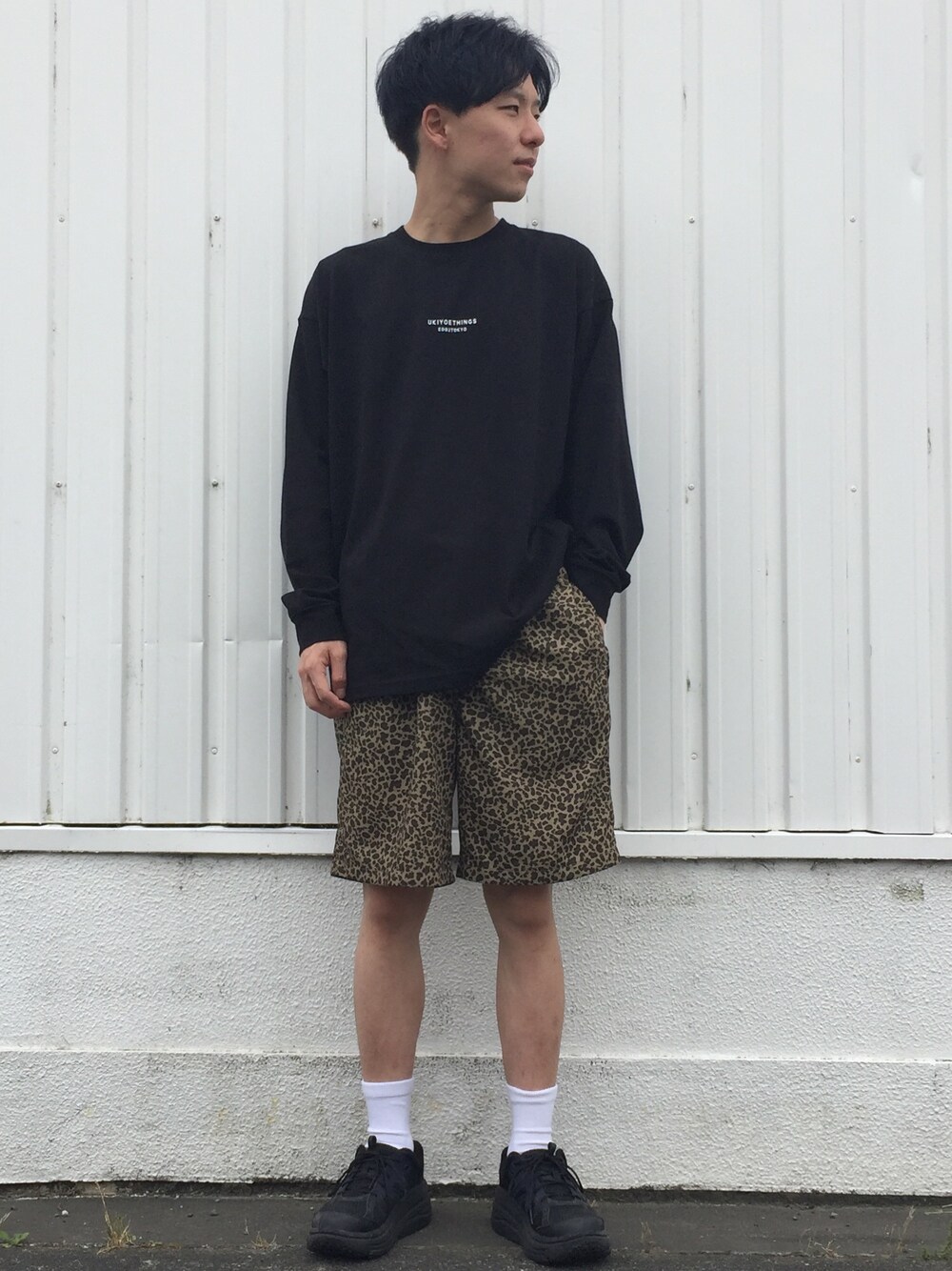 ショーツにロンTコーデです◎ バックプリントが目を惹くデザインに、柄のショーツを合わせる事でトレンド感を! 足元はダッドスニーカーでスポーツMIXに◎ insta @ta_gram__