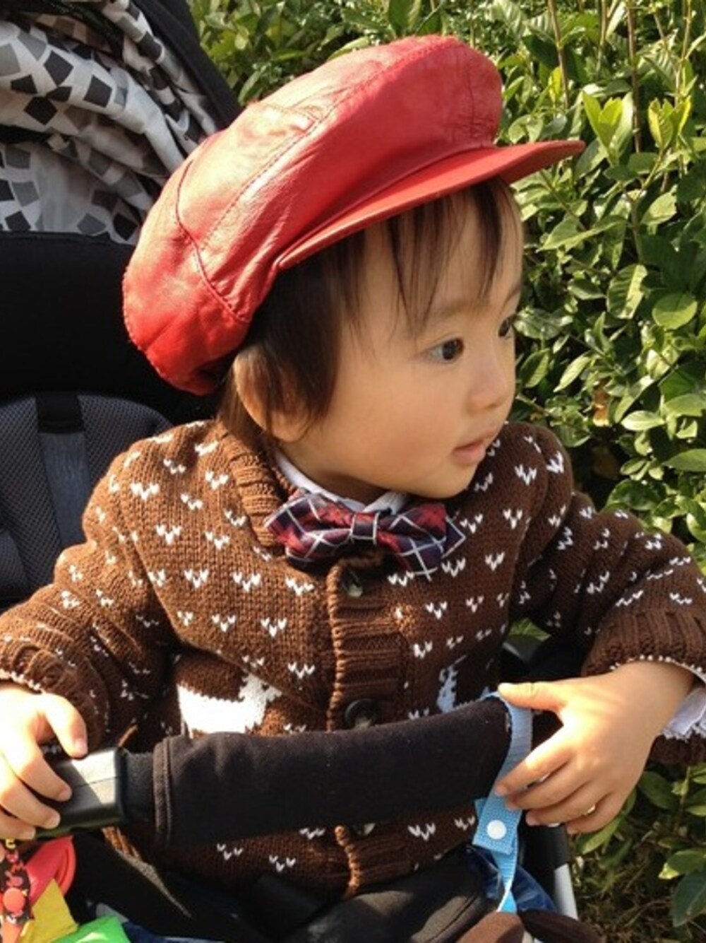 赤いレザーキャスケット カウチン風ニットカーデ 蝶ネクタイ♪(´ε` )