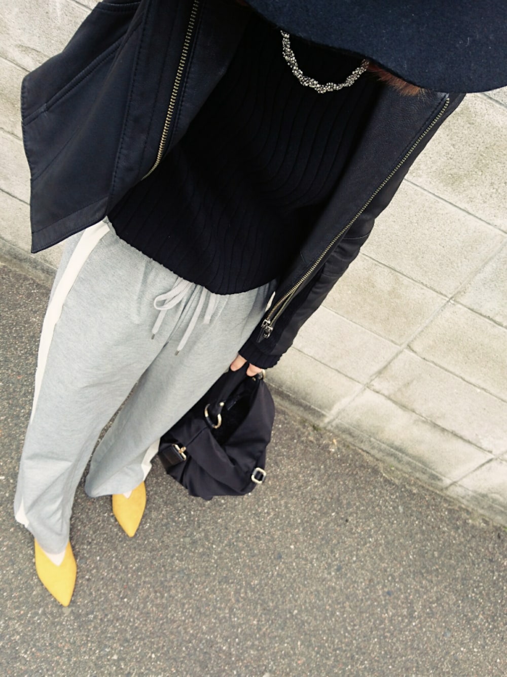 today's! モノトーンに差し色イエロー🌻 また、ラインパンツ← 帽子は黒ハット 着まわしコーデ🙆 new 大理石スマホケース お気に入り♡
