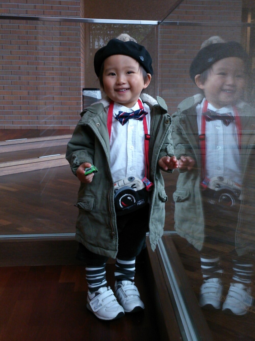 あまりファー見えてませんが(^^; カメラバックには大好きなカーズのトミカが入ってます♪ ファー付きベレー帽→サニーランドスケープ(ファーは他の帽子についてたものをつけました) シャツ→古着 パンツ→サニーランドスケープ(ボーダーのレギンスとセット) コート→GAP カメラバック→? 超ネクタイ→赤ちゃん本舗 靴→ニューバランス