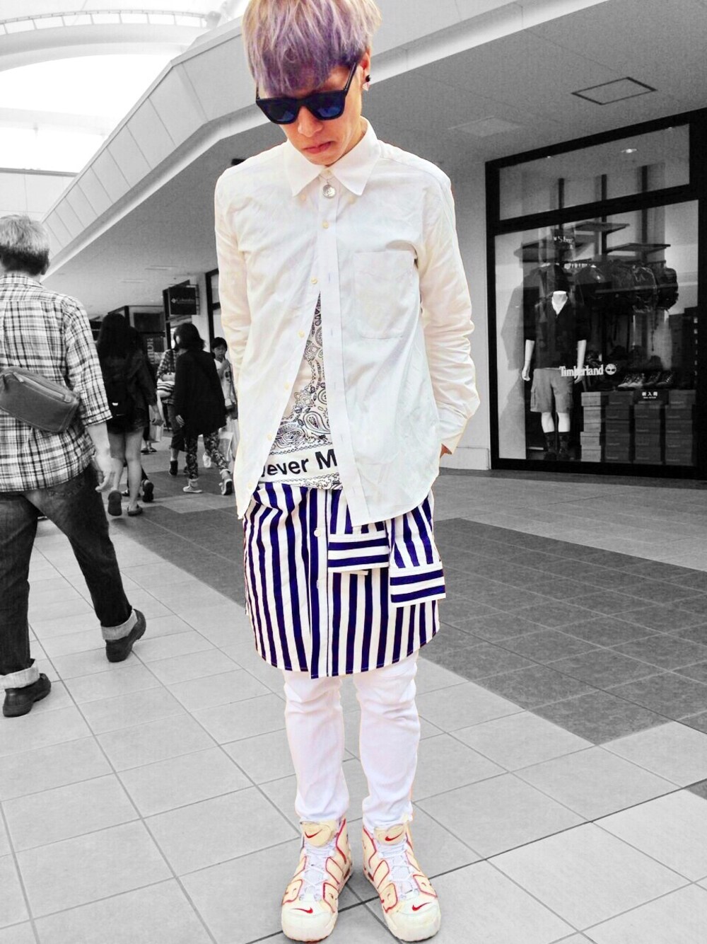 シャツ TOMMY Tシャツ MINUTE RULE 腰巻き シャツ BEN DAVIS スキニー MINUTE RULE スニーカー NIKE アウトレットに行ってきました。 髪はお盆仕様で銀髪です。 このアプリで見つけた腰巻きスタイルに挑戦。 この巻き方個人的に好き。またしよう。