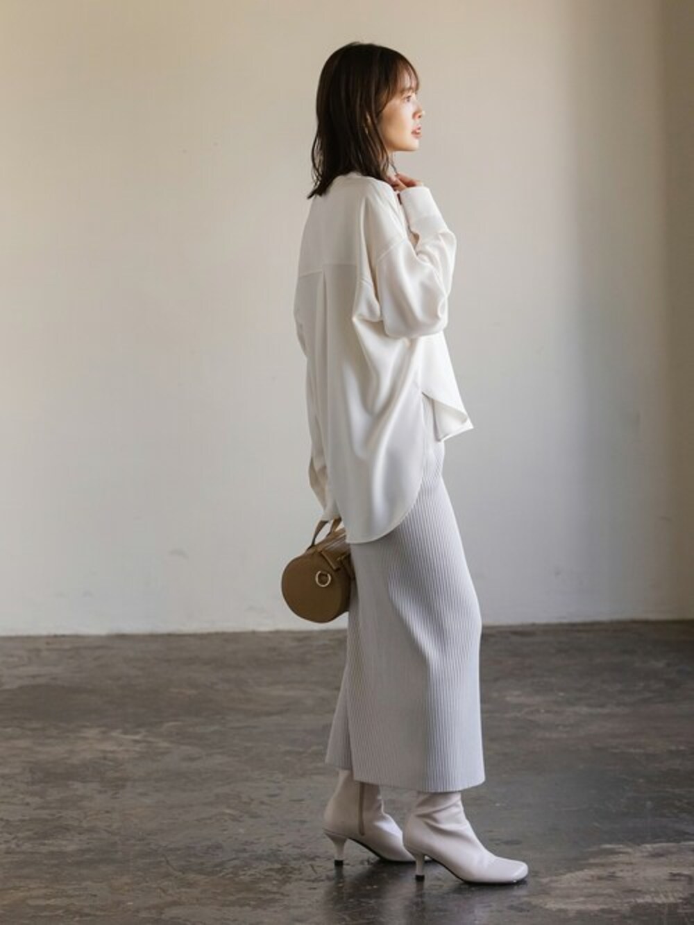 ★11/30より24SSご予約スタート! 【ワークディテールドレープシャツ】 大きめのフロントポケットなどワークディテールを採用しながら、とろみのある素材感で上品に仕上がったシャツ。 丈感には前後差があり、ロングボトムスと合わせた際には前から見ると好バランスなミドル丈、後ろから見ると気になる部分を覆ってくれるロング丈の良い所取りな万能シャツです◎ 全体的に明るいニュアンスカラーで合わせて上品にコーディネートしました。 ○身長:155cm ○年齢:20代 ○体型:細身(もも周りが気になる) ○普段サイズ:34 公式Instagramも是非ご覧ください!! →@nb_aruga