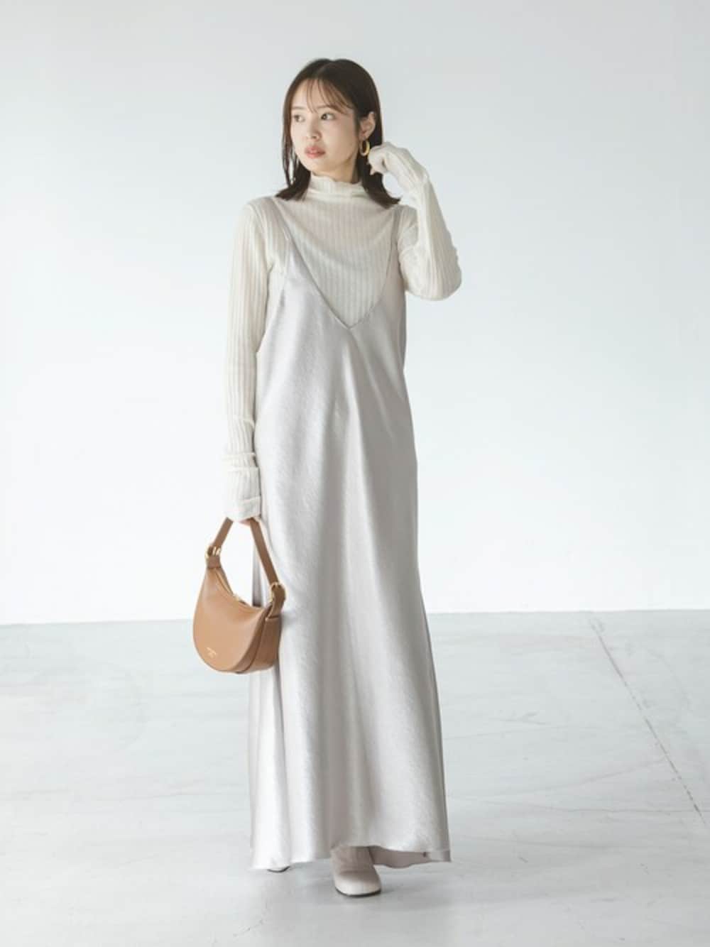 ★12月入荷新商品 【シルクカシミヤワイドリブニット】 トーンの明るいホワイト&ベージュの上品コーデ。 インナーを変えてレイヤードパターンを楽しめる深めVのキャミワンピースに、新作のリブニットをオン♡ ワンピースのサテン地と、ニットのシルクカシミヤで上品で程よい薄さが大人っぽさとフェミニンさを調和。 ホリデーシーズンのおでかけコーデにもピッタリ◎。 ○身長:155cm ○年齢:20代 ○体型:細身(もも周りが気になる) ○普段サイズ:34 公式Instagramも是非ご覧ください!! →@nb_aruga