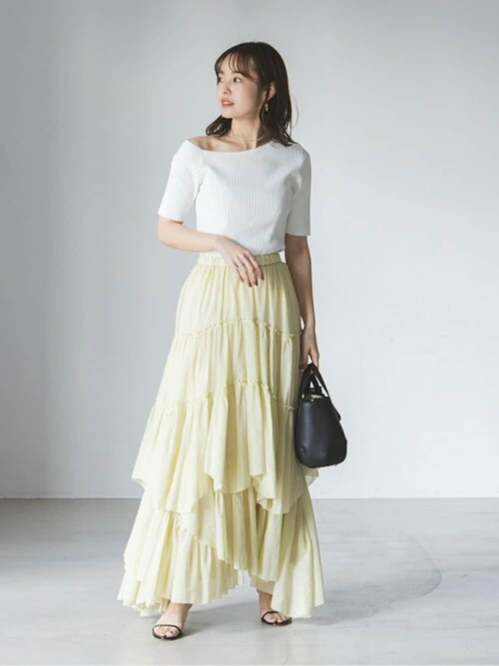 【アシンメトリータイトニット】 フィット&フレアのシルエットが今年らしい着こなし◎ まろやかなイエロースカートで春っぽさ満点なフェミニンコーデの完成◎ デコルテや肩を出すことで、抜け感が出ます。 ※シューズは23SSの完売商品です。 ※スカート詳細 商品名:【CASA FLINE】コトンティアードスカート 商品番号:24060250000410 価格:¥33,000+税 ○身長:155cm ○年齢:20代 ○体型:細身(もも周りが気になる) ○普段サイズ:34 公式Instagramも 是非ご覧ください!! →@nb_aruga