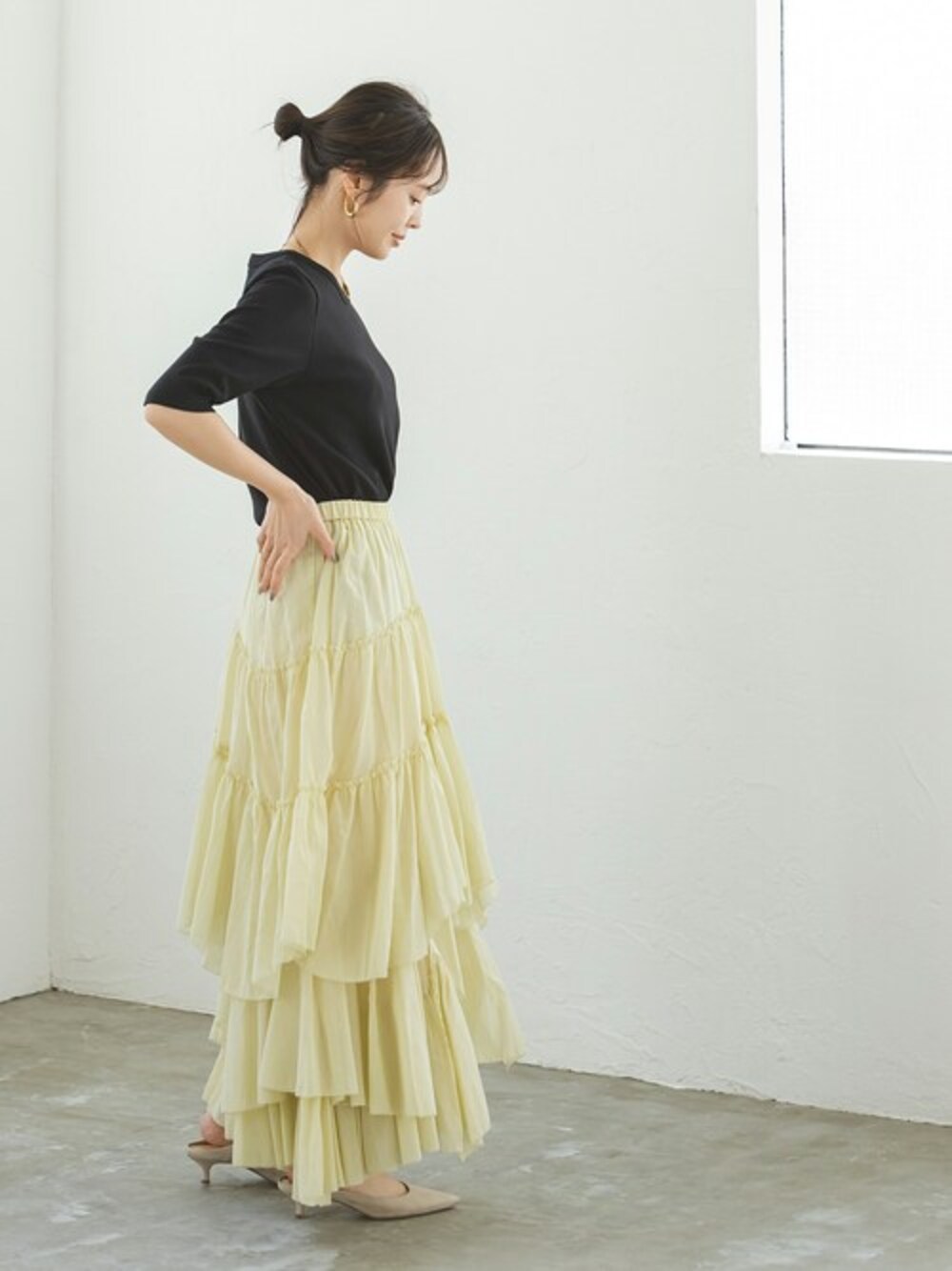 【スビンコットン5分袖Tシャツ】 フェミニンな主役スカートを引き立たせるベーシックなTシャツ。 春先に嬉しい大人っぽく決まる5分丈もポイント。 ブラックカラーで甘さを引き締めつつもコーディネートの邪魔にならない、まさに名脇役なTシャツです◎ 大振りのアクセサリーでアクセントをプラス。 商品名:【CASA FLINE】コットンティアードスカート 商品番号:24060250000410 価格:¥33,000+税 ○身長:155cm ○年齢:20代 ○体型:細身(もも周りが気になる) ○普段サイズ:34 公式Instagramも是非ご覧ください!! →@nb_aruga