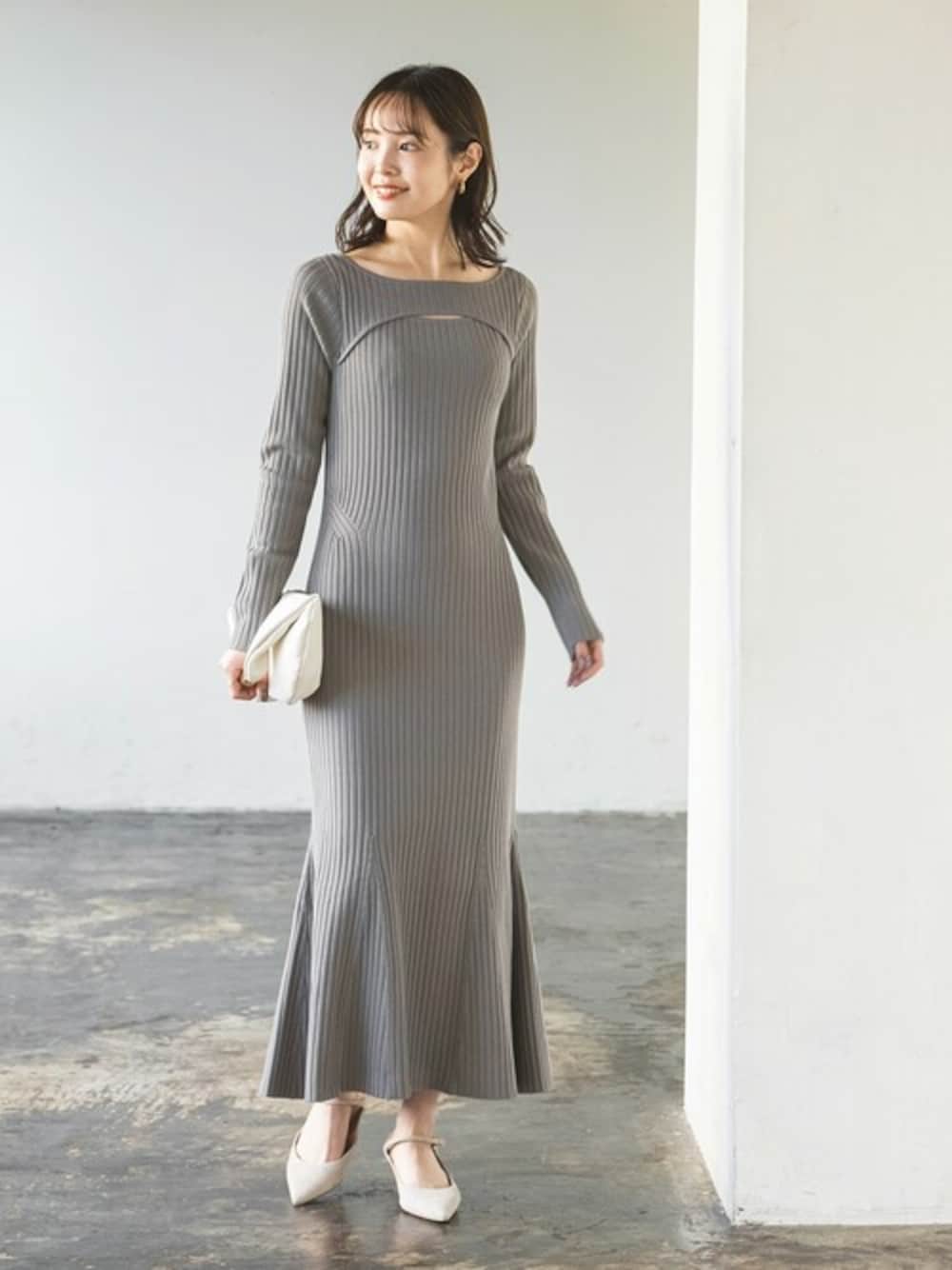 minani.a(NOBLE 本社)のワンピース「デコルテオープンニットワンピース」を使ったコーディネート