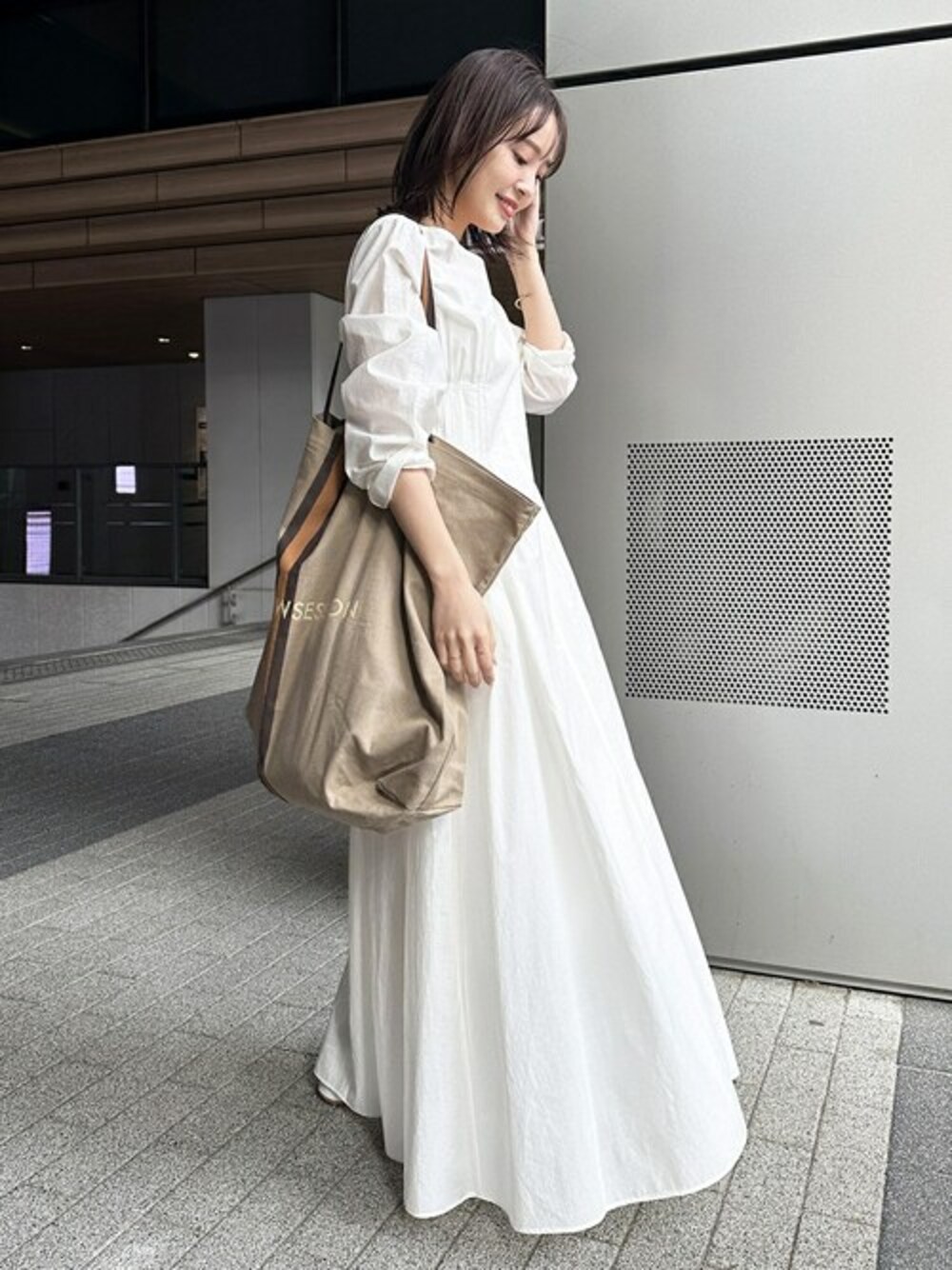 【N.Jamトートバッグ】 大人気のN.JamトートがWEB限定で追加決定! コーデの主役にもなるラージサイズは、旅行も行けるほどの大容量! クリーンなホワイトワンピを合わせて、フェミニンカジュアルなスタイリングにしてみました。 ※シューズは23SSの完売商品です。 ○身長:155cm ○年齢:20代 ○体型:細身(もも周りが気になる) ○普段サイズ:34 公式Instagramも 是非ご覧ください!! →@nb_aruga