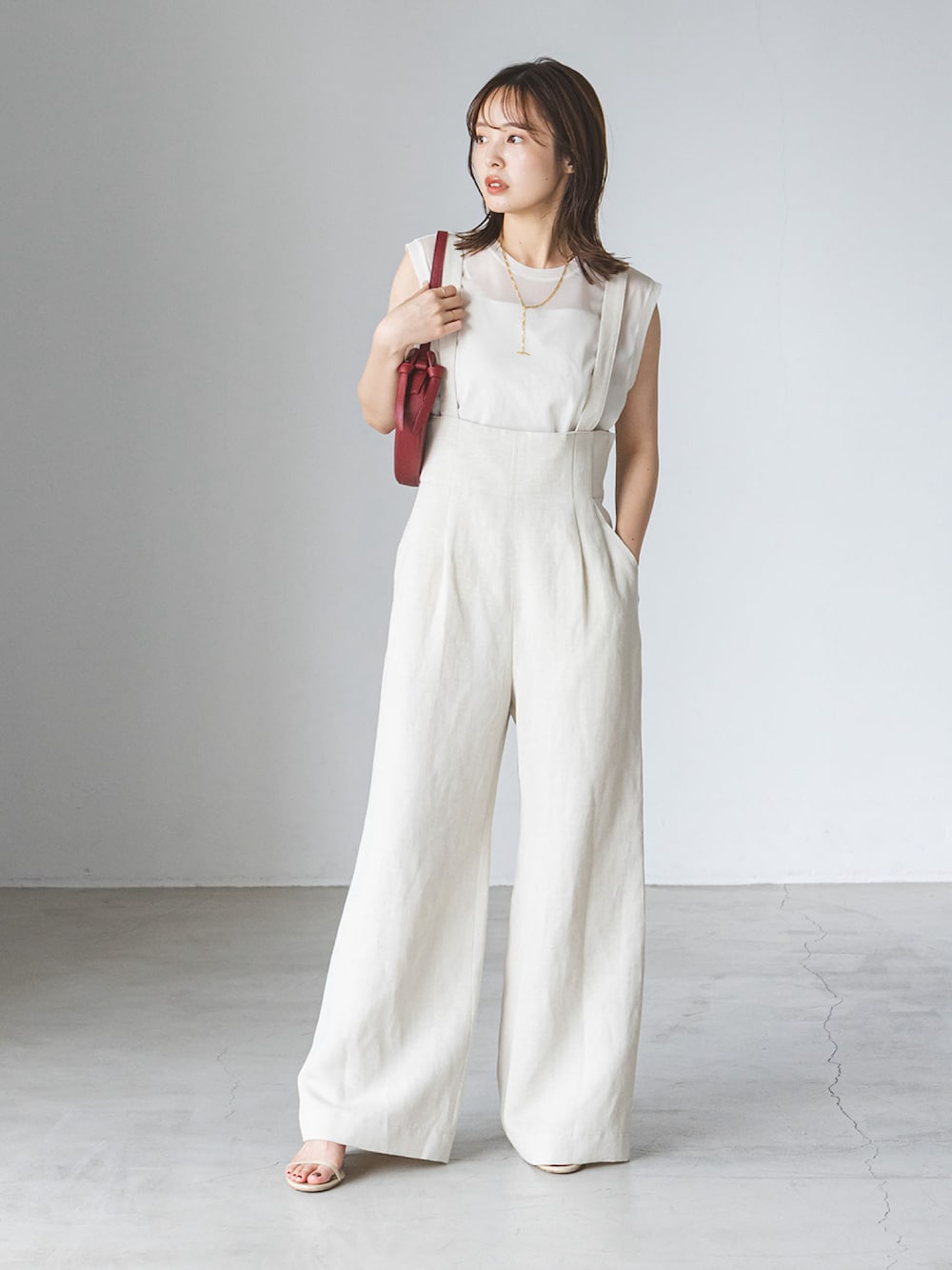 ハイウエストサロペットパンツ ウエストのダーツのおかげですっきり見え&大人っぽく着られるサロペットパンツが入荷! ワントーンで合わせて子供っぽくならないように意識◎。 夏はノースリーブを合わせることでIラインシルエットを強調して、さらにスタイルアップ! ※バッグは8月入荷予定 YUZEFI FORTUNE COOKIE 商品番号:24092250000530 ¥74,000 +税 ○身長:155cm ○年齢:20代 ○体型:細身(もも周りが気になる) ○普段サイズ:34 公式Instagramも是非ご覧ください!! →@nb_aruga