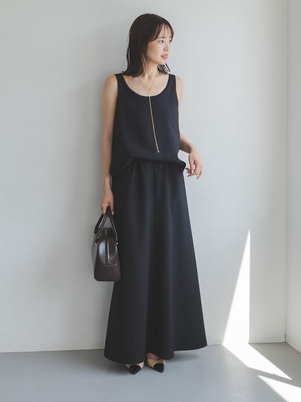 minani.a(NOBLE 本社)のワンピース「ウールMIXツイルレイヤードワンピース」を使ったコーディネート