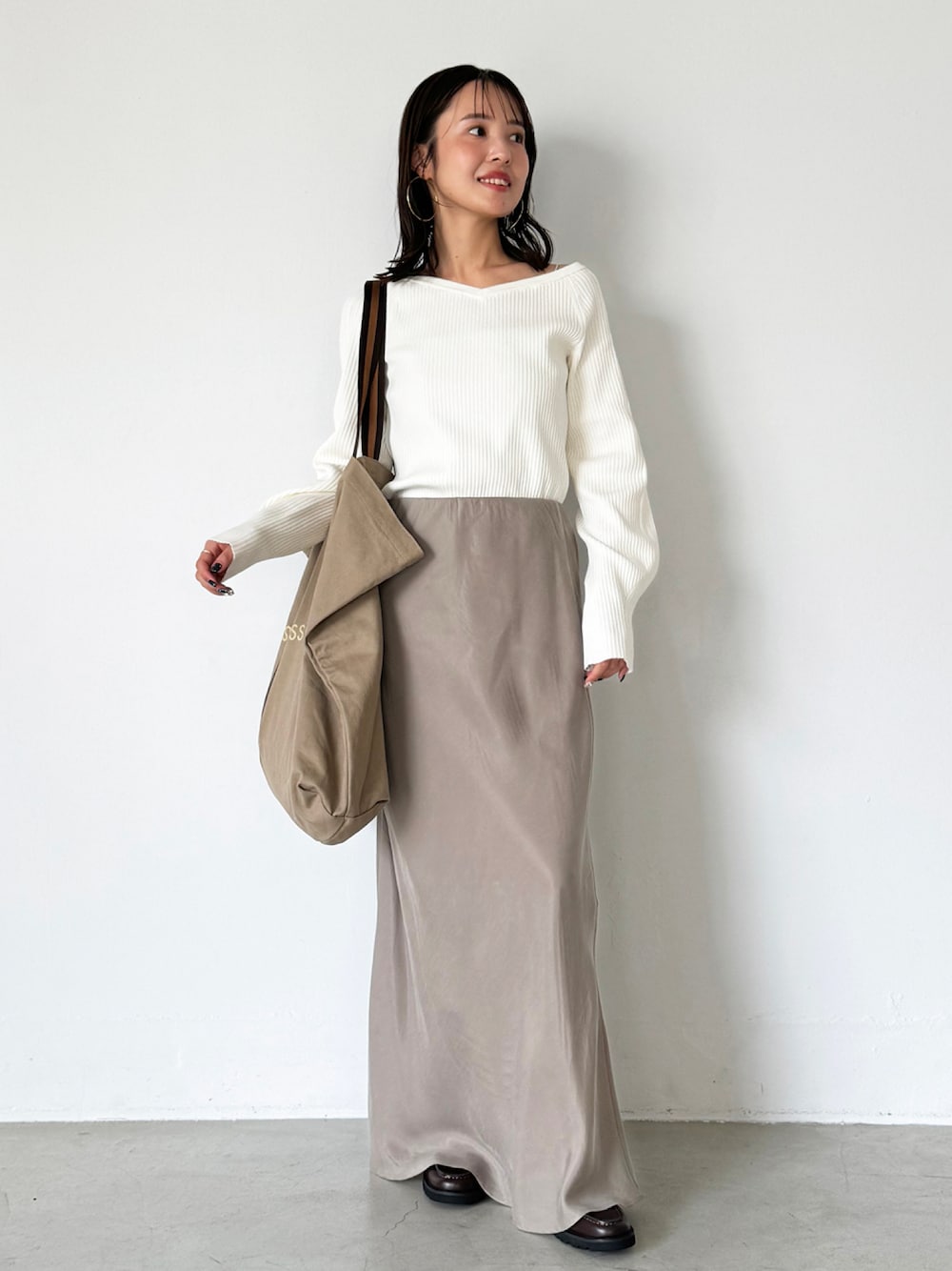 minani.a(NOBLE 本社)のニット/セーター「ワイドVネックプルオーバー」を使ったコーディネート