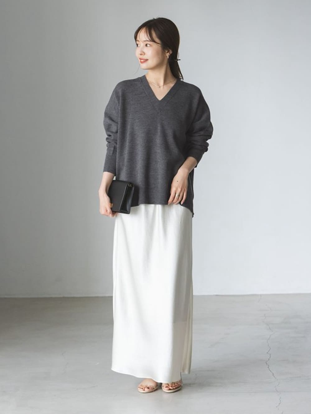 シンプルなVネックニットに艶やかなサテンスカートを合わせて、大人フェミニンな着こなしに。 トップスの裾はあえてアウトにすることで、程よいリラックス感を演出。 足元はヌーディなバーサンダルで抜けを作ると、すっきりとバランス良くまとまります。 ----------------------------------- minami.a ○身長:155cm ○年齢:20代 ○体型:細身(もも周りが気になる) ○普段サイズ:34 公式Instagramも是非ご覧ください!! →@nb_aruga -----------------------------------