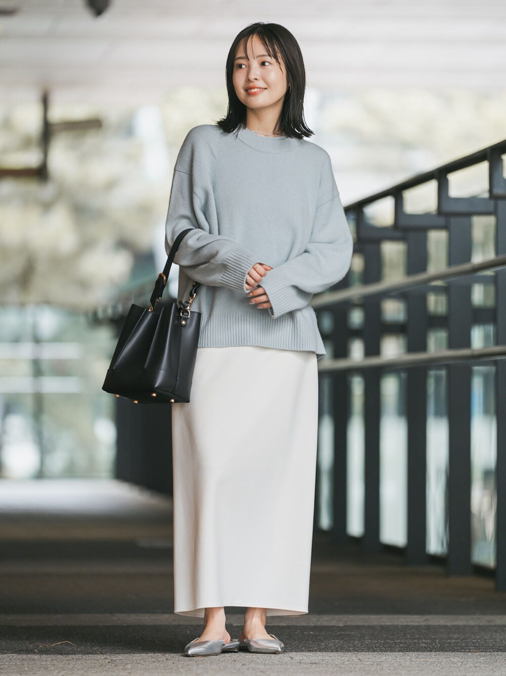 【Super160ダブルリブクルーニット】 毎年大好評のSuper160素材が新しい形になって登場! 抜群な肌当たりが魅力のニットは、落ち着いたくすみブルーをチョイス。 ホワイトのタイトスカートに合わせて、清潔感のあるキレイめコーデにまとめてみました。 足元はメタリックシルバーでさりげなく華やかに。 ○身長:155cm ○年齢:20代 ○体型:細身(もも周りが気になる) ○普段サイズ:34 公式Instagramも 是非ご覧ください!! →@nb_aruga