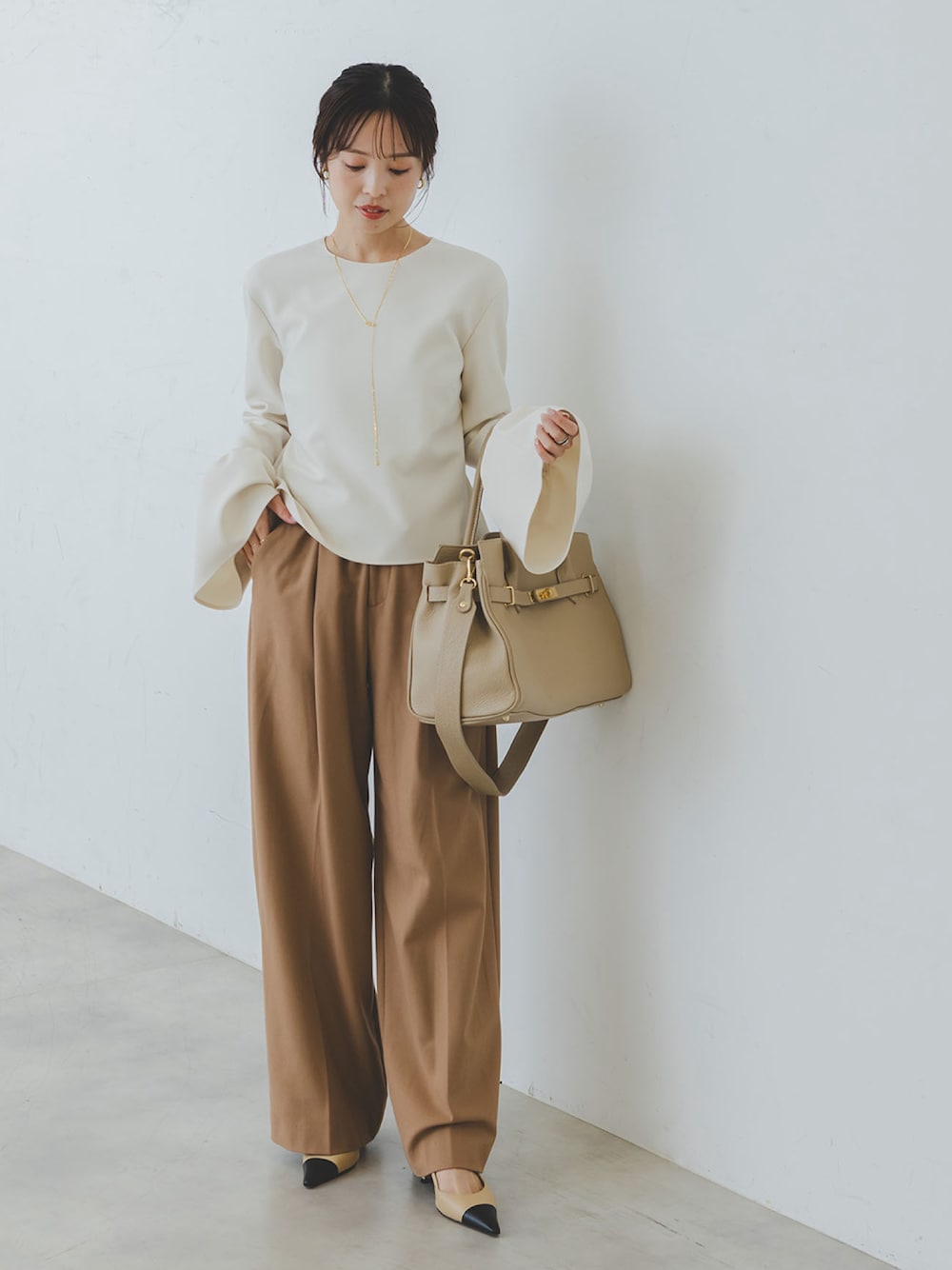 カットソーのようなストレスフリーな着心地でありながら、キレイめに着用できる気映えトップス。 キャメルカラーのボトムスを取り入れ、シーズンムードたっぷりのスタイリングに仕上げました。 ○身長:155cm ○年齢:20代 ○体型:細身(もも周りが気になる) ○普段サイズ:34 公式Instagramも是非ご覧ください!! →@nb_aruga