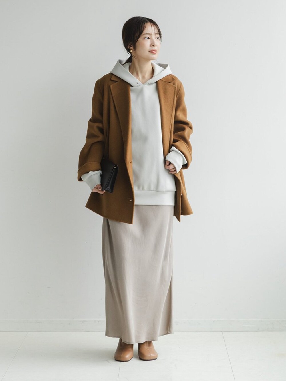 カジュアルダウンが狙えるフーディをコートのインナー使いで楽しんだコーディネート。 立体感のある肉厚の素材なので自然と立ち上がるちったい的なフードがポイント。 上半身にボリュームを持たせたときはサテンスカートでボトムはすっきり見えを意識しました。 ○身長:155cm ○年齢:20代 ○体型:細身(もも周りが気になる) ○普段サイズ:34 公式Instagramも是非ご覧ください!! →@nb_aruga