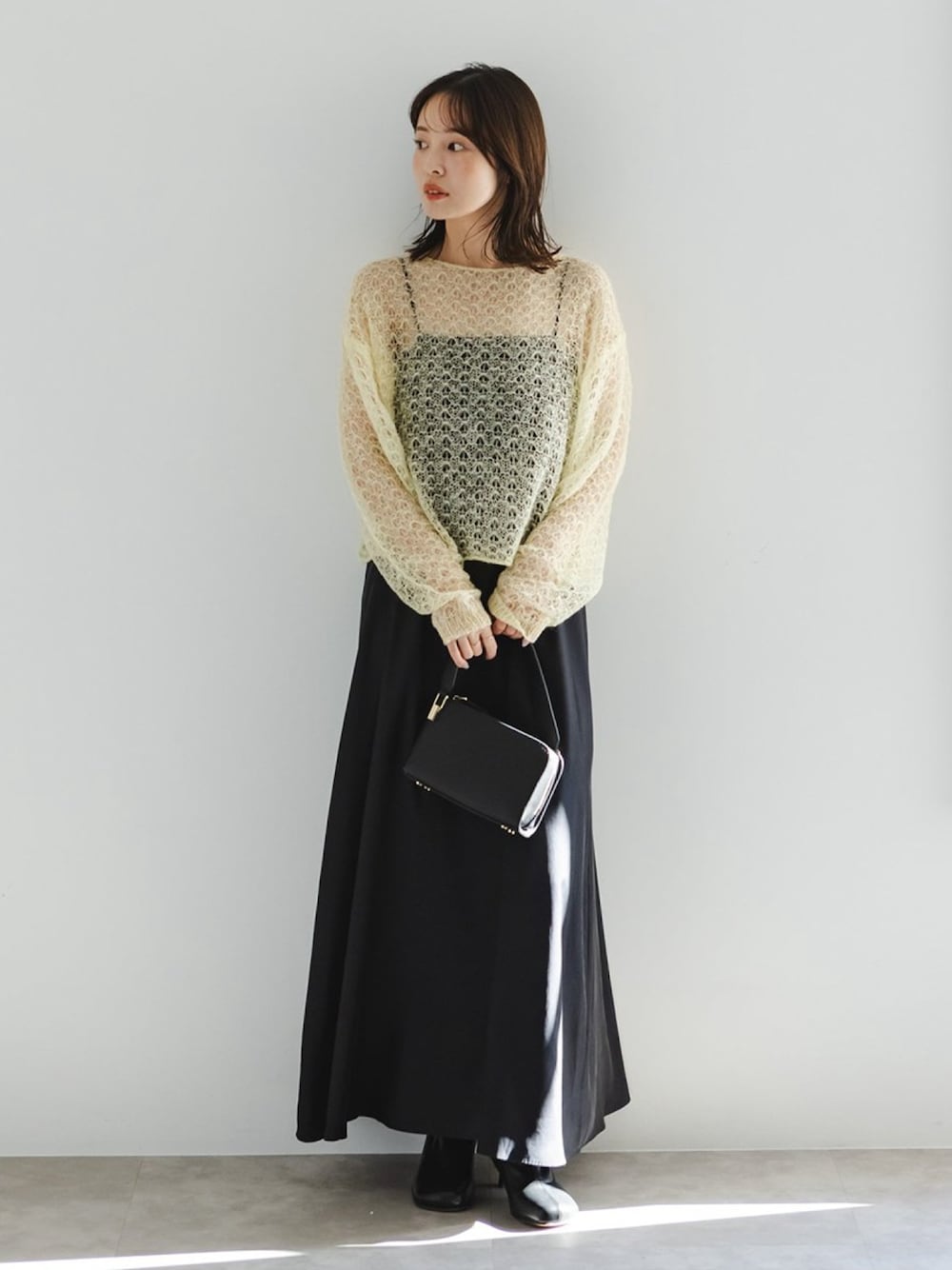 レースのような愛らしく繊細な編地に惚れるシアーニット。 イエローカラーも気分を上げてくれます◎。透け感を活かしてキャミワンピースをイン。 とても軽く、透け感もあるので春先のコーデでも活躍! ○身長:155cm ○年齢:20代 ○体型:細身(もも周りが気になる) ○普段サイズ:34 公式Instagramも是非ご覧ください!! →@nb_aruga