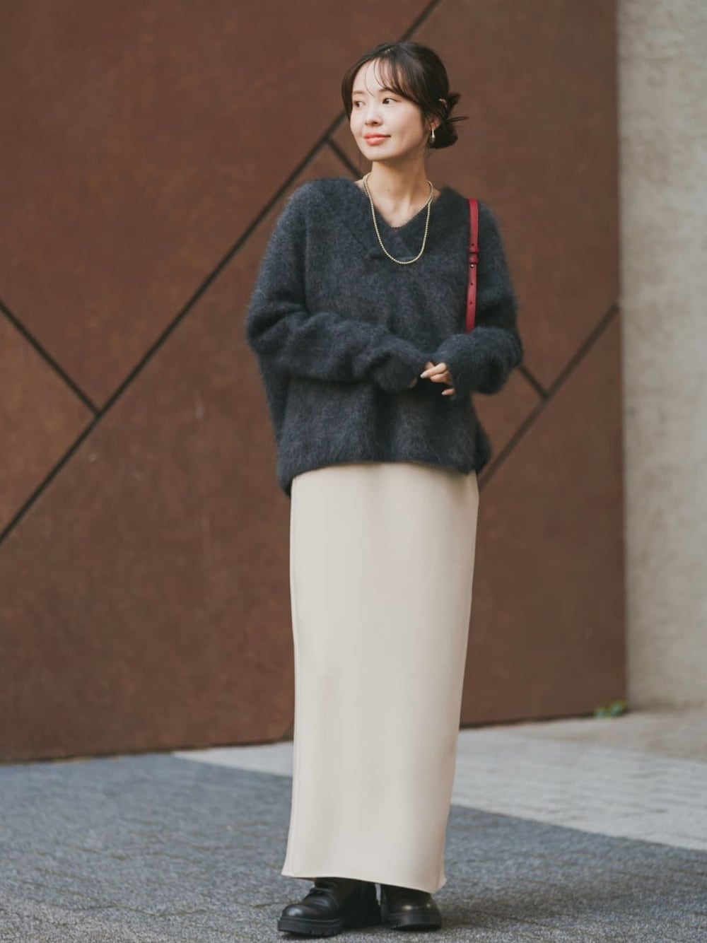【ファーニットVネックプルオーバー】 デコルテが綺麗に見えるV開きのプルオーバー。 チャコールグレー×ニュアンスグレーで洒落感を高めつつ、ボルドーのバッグでアクセントを。 足元レースアップシューズでカジュアルにフィニッシュ◎ ○身長:155cm ○年齢:20代 ○体型:細身(もも周りが気になる) ○普段サイズ:34 公式Instagramも 是非ご覧ください!! →@nb_aruga