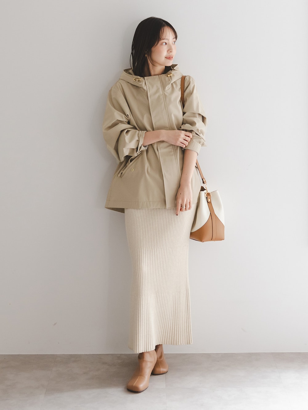 トーンの異なるベージュでグラデーションを作った、女性らしさとオシャレ感を併せ持つ優秀スタイル。 トップにボリュームがあるので、ボトムはすっきりとタイトに仕上げると好バランス! ○身長:155cm ○年齢:20代 ○体型:細身(もも周りが気になる) ○普段サイズ:34 公式Instagramも是非ご覧ください!! →@nb_aruga