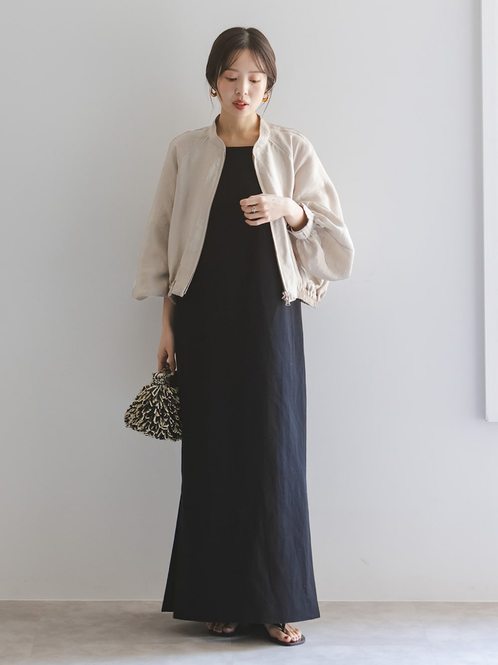 タフタ素材に加工を施すことで立体感のあるシルエットがポイントとなったブルゾン。 リネンのドライタッチなワンピースとのバランスが絶妙で、シンプルながらオシャレ見えする着こなしに仕上がります。 ○身長:155cm ○年齢:20代 ○体型:細身(もも周りが気になる) ○普段サイズ:34 公式Instagramも是非ご覧ください!! →@nb_aruga