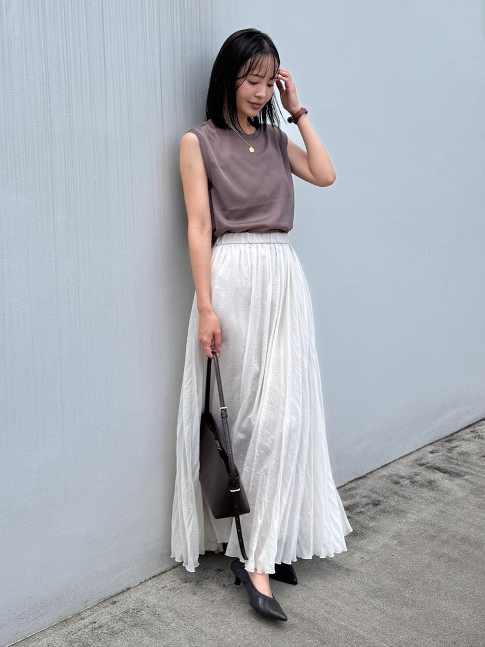 大人気のシアートップスに新色が登場! オトナっぽく決まるニュアンスブラウンが可愛い新色のシアースキニーノースリーブトップス。 ふんわりとしたスカートを主役にしたので女性らしいく決まるカットソーが重宝。 透け感も絶妙でブラックのインナーを着ても浮かずに馴染みました◎ ○身長:155cm ○年齢:20代 ○体型:細身(もも周りが気になる) ○普段サイズ:34 公式Instagramも是非ご覧ください!! →@nb_aruga