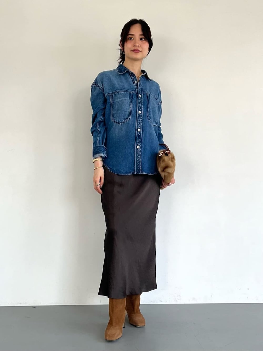 【スージングデニムビッグポケットシャツ】 フロントの大きなポケットがポイントのデニムシャツ。 すっきりしたシルエットの為サテンスカートとのスタイリングで更に女性らしい着こなしに◎ インディゴのカラーがカジュアルになりすぎずにさりげなく決めすぎない雰囲気を出してくれます。 トレンド問わず長く使用出来るアイテムなので、普段デニムを取り入れない方でも安心して着用頂けます! ●年齢:20代前半 ●身長:160cm ●体型:普通(二の腕気になる) ●普段サイズ:36サイズ ●着用サイズ:デニムシャツ(F) ●パーソナルカラー:ブルベ ●個人インスタ→@nb_eguchi