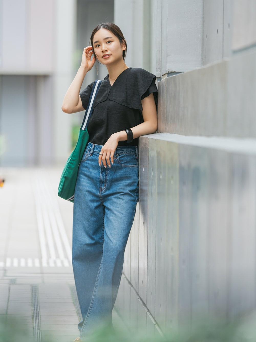 フェミニンブラウス×デニムの大人カジュアル 鮮やかなグリーンのトートを差し色としてON ●年齢:20代前半 ●身長:160cm ●体型:普通(二の腕気になる) ●普段サイズ:36サイズ ●パーソナルカラー:ブルベ ●個人インスタ→@nb_eguchi