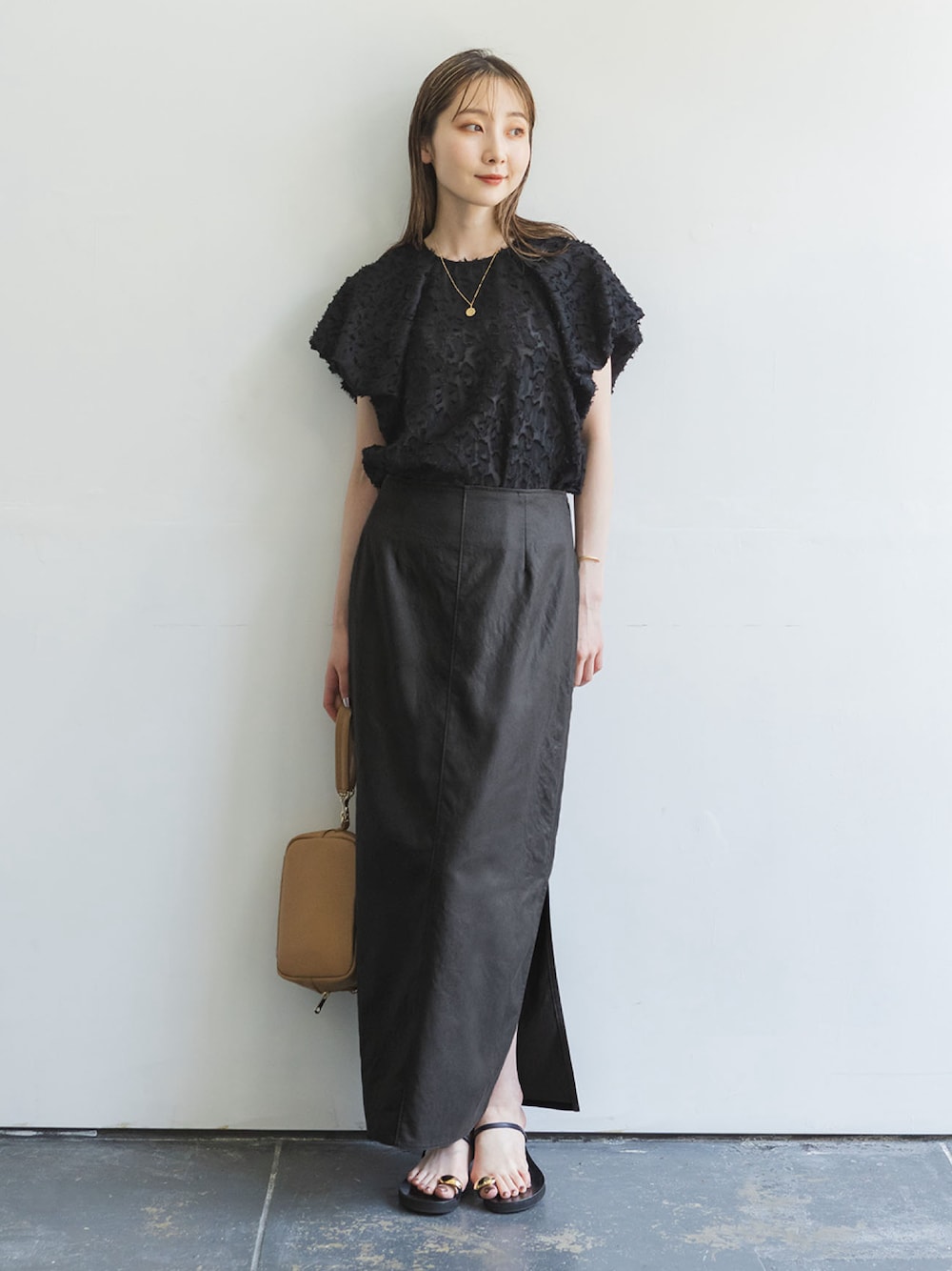 Rina(NOBLE 本社)のスカート「フェイクスウェードサイドスリットタイトスカート」を使ったコーディネート