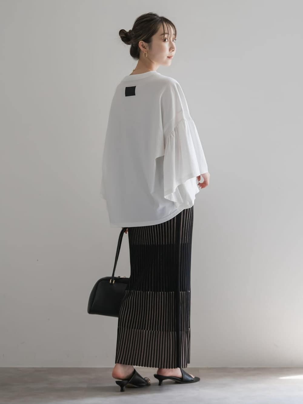Tシャツスタイルをグッと大人っぽく女性らしく仕上げてくれるのはタイトニットスカート。 ゆったりとしたCOGのデザインTシャツに相性◎で、ニットと言えど今から着られるドライな素材感も嬉しい。 モノトーンで合わせつつ、スカートの配色がさり気なくアクセントに。 ●年齢: 20代 ●身長: 164cm ●普段サイズ: 36(S)または38(M)サイズ ●パーソナルカラー: ブルベ ●骨格: ウェーブ いつもSNAPを見てくださりありがとうございます☺︎ NOBLE公式スタッフのインスタグラムも始めたので、 ぜひフォローお願いいたします♡ アカウント→@nb_wajima