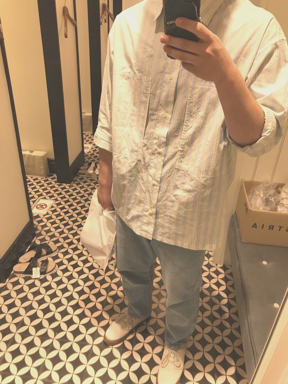 久々の投稿 水色メインのオレンジ、緑のストライプのシャツに淡い色のデニム セール商品のみの激安コーデ(笑)