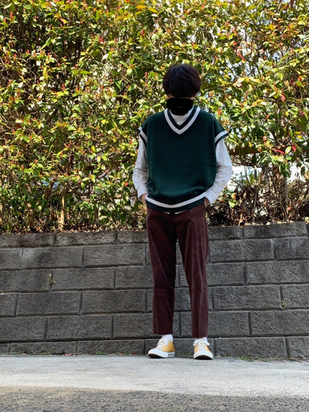 YAKAのベスト「ビッグシルエット Vネック チルデン ニットベスト」を使ったコーディネート