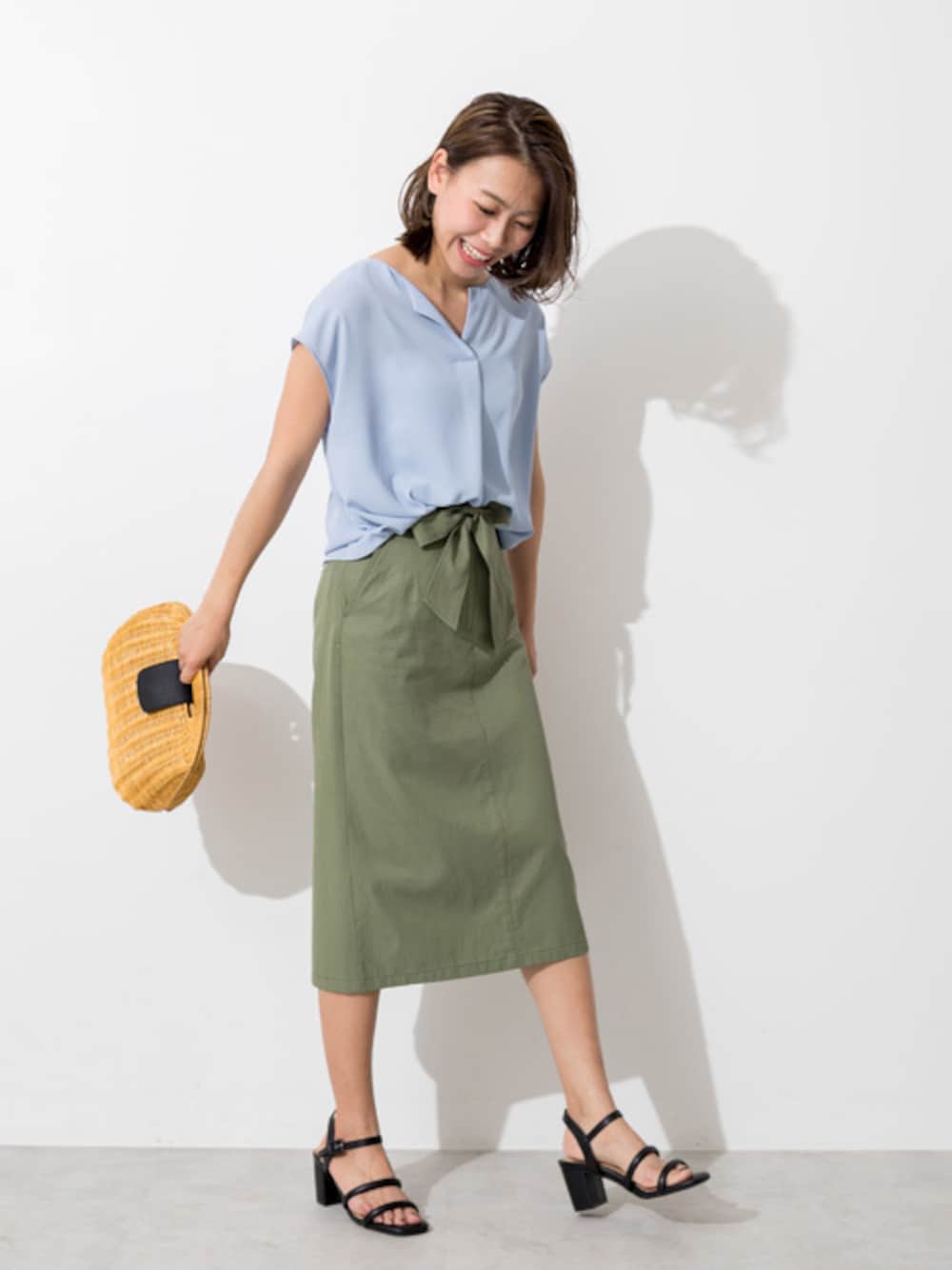 爽やかなブルーで清涼感を求めたい夏。定番の白合わせも鉄板だけど、渋カラーのカーキ合わせで鮮度UPを狙いたい。タイトスカートを選べば女性らしさもプラス♪