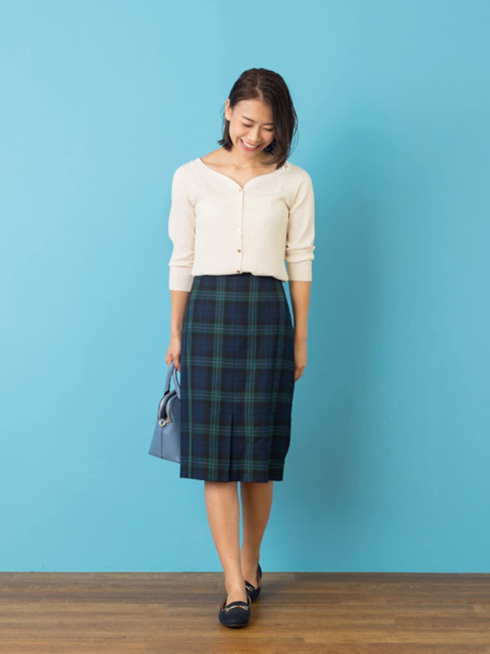 秋注目のチェック柄はネイビーベースのブラックウォッチとタイトなシルエットで大人顔に。まだ暑い夏の通勤には白を効果的にプラスして爽やかさも演出。