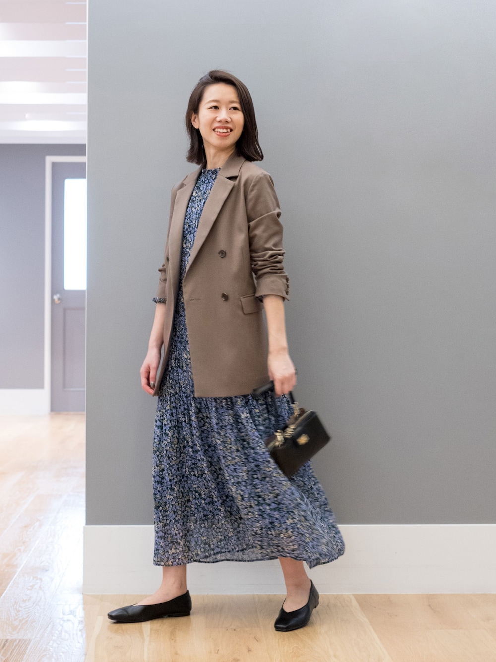 裾に向かって緩やかになるプリーツラインでふんわり柔らかなラインを描くワンピースには、マニッシュなジャケット合わせが今年らしい♪
