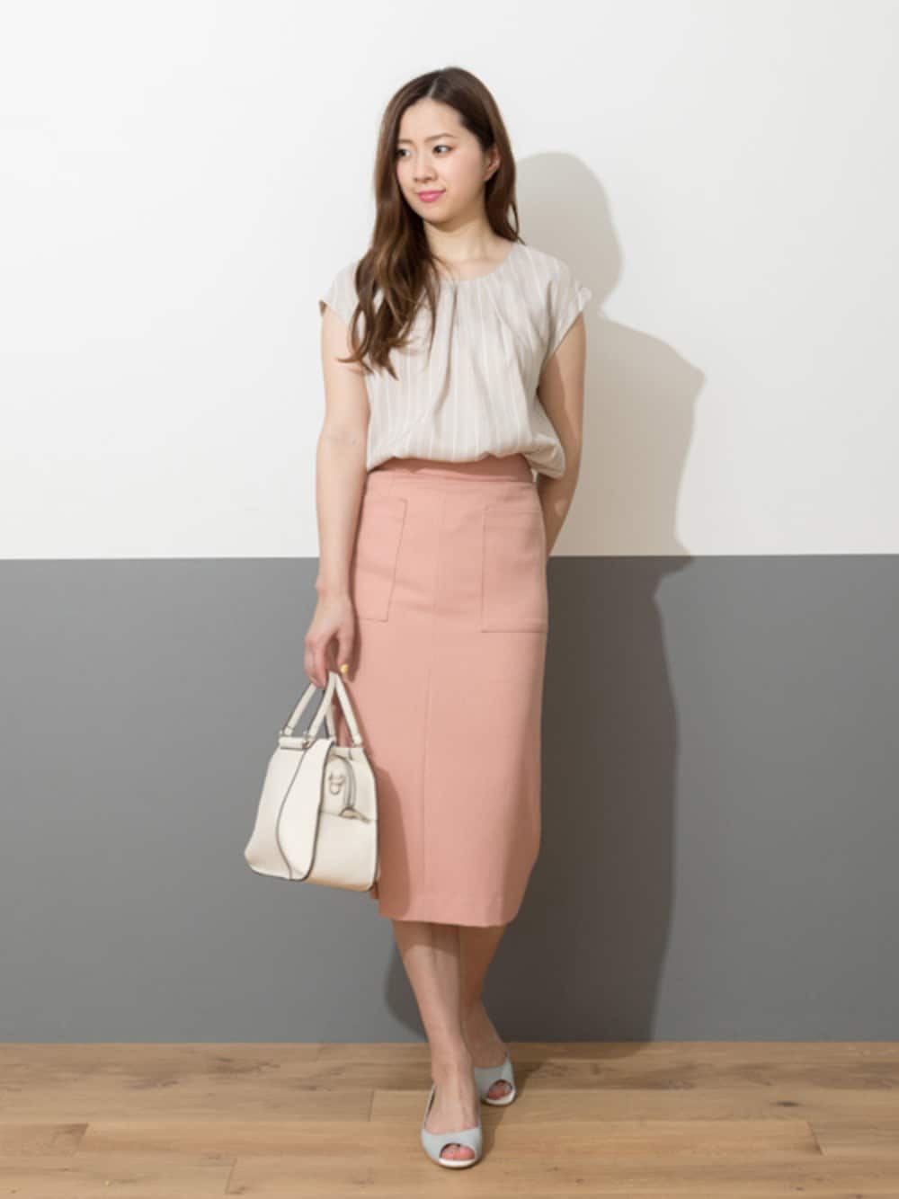 女性らしい淡めカラーの組み合わせは甘くなりすぎないように、縦のラインを意識してシャープに仕上げればグッとオトナ顔コーデに。