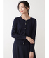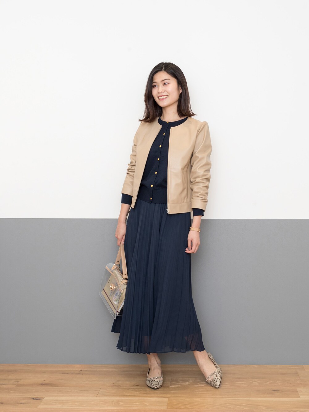重たくなりがちなネイビーのワントーンスタイルは、シフォンプリーツで軽やかさをプラスして。着るほどになじむラムナッパのレザーブルゾンは上品ベージュを選んで春まで活躍♪