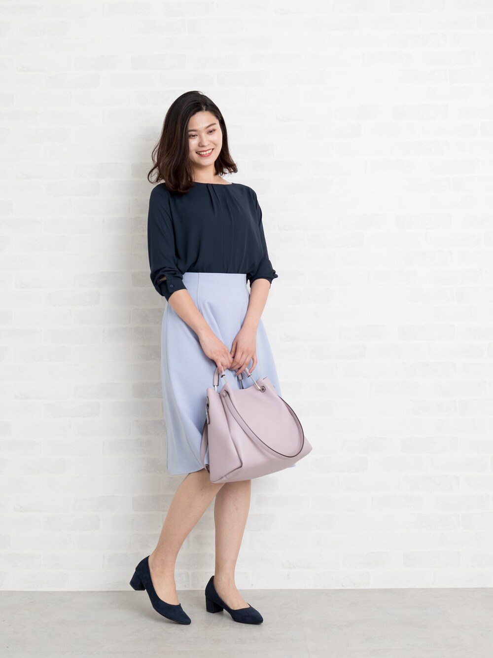 爽やかさと清潔感のあるライトブルーならオフィスでも挑戦しやすいカラーボトム。6枚パネルで立体的に仕上げのスカートは、キレイなフレアラインが叶います。