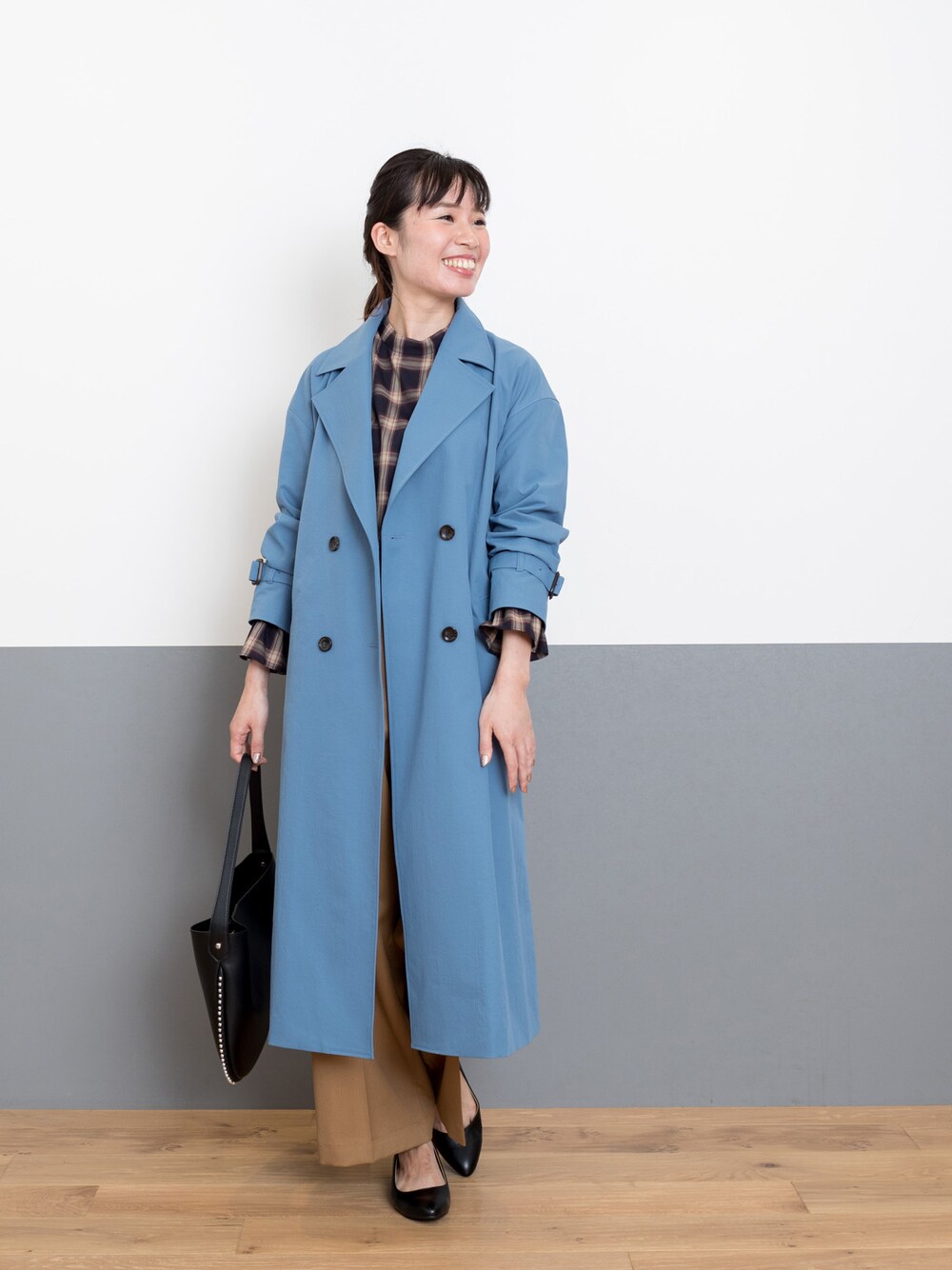 こっくり秋コーデに、ブルーのトレンチコートが新鮮!秋の通勤スタイル。 今年らしいオーバーサイズシルエットのトレンチコートは、コーデを選ばず羽織りやすいのがポイント。