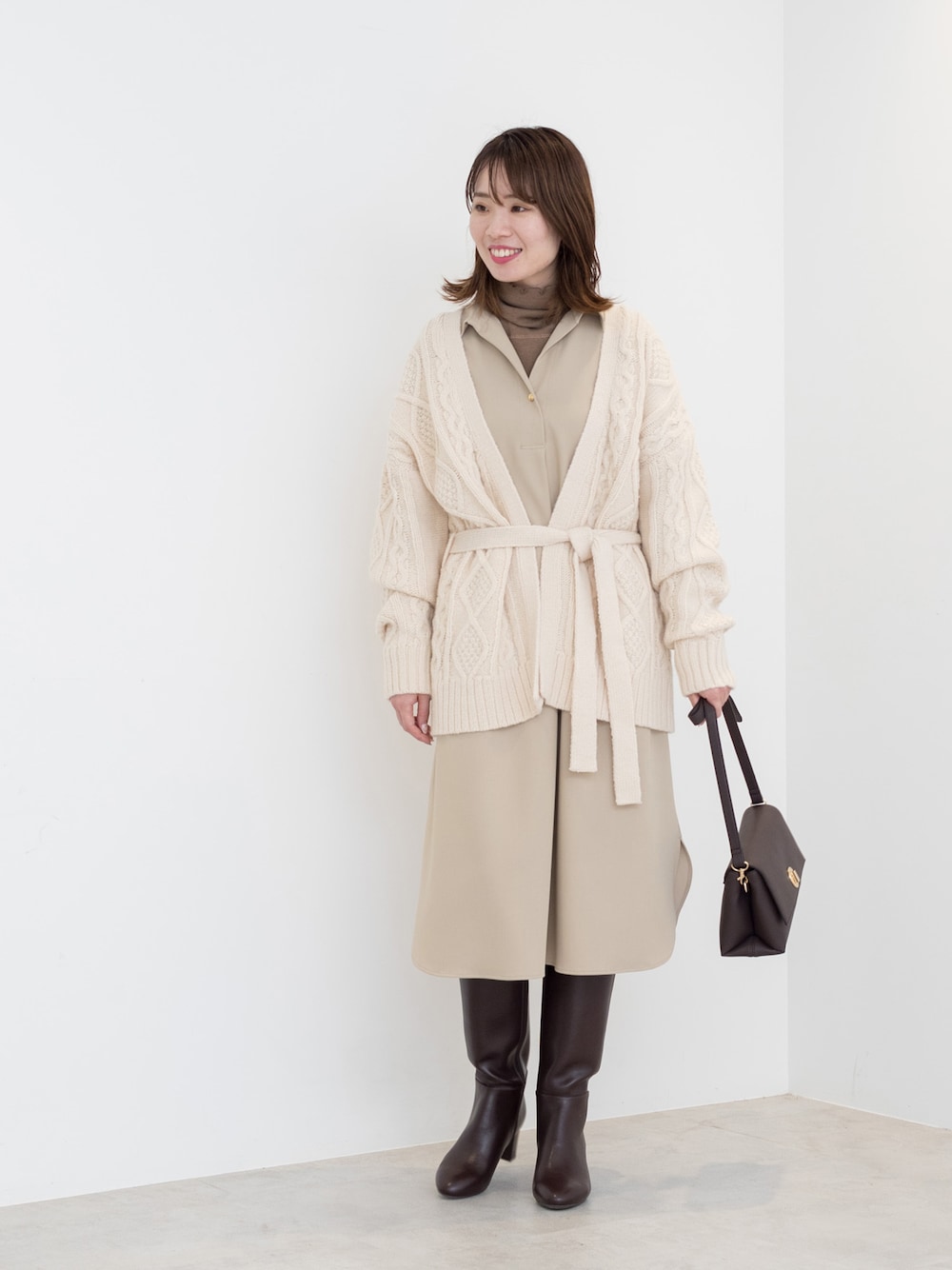 ケーブルのカーディガン・シャツワンピース・タートルニット、ひとつひとつはベーシックアイテムでも重ねることで新鮮なスタイリングに。オフ~ベージュの色の重なりで上品レディに仕上がります。