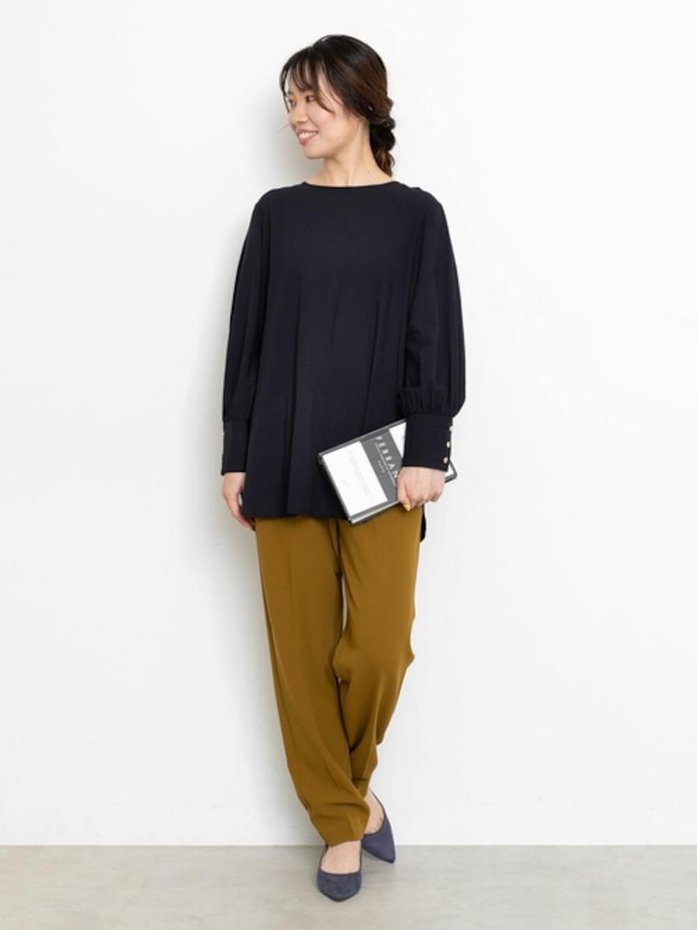 ラウンドしたヘムラインでふんわりアウトにして着るのがおすすめのチュニックブラウス。前後2wayなので着回しにも重宝しそう♪きちんと見えするセンタープレスのパンツは、カットソー素材でシワになりづらく着心地◎オフィスはもちろん、テレワークにもおすすめ♪