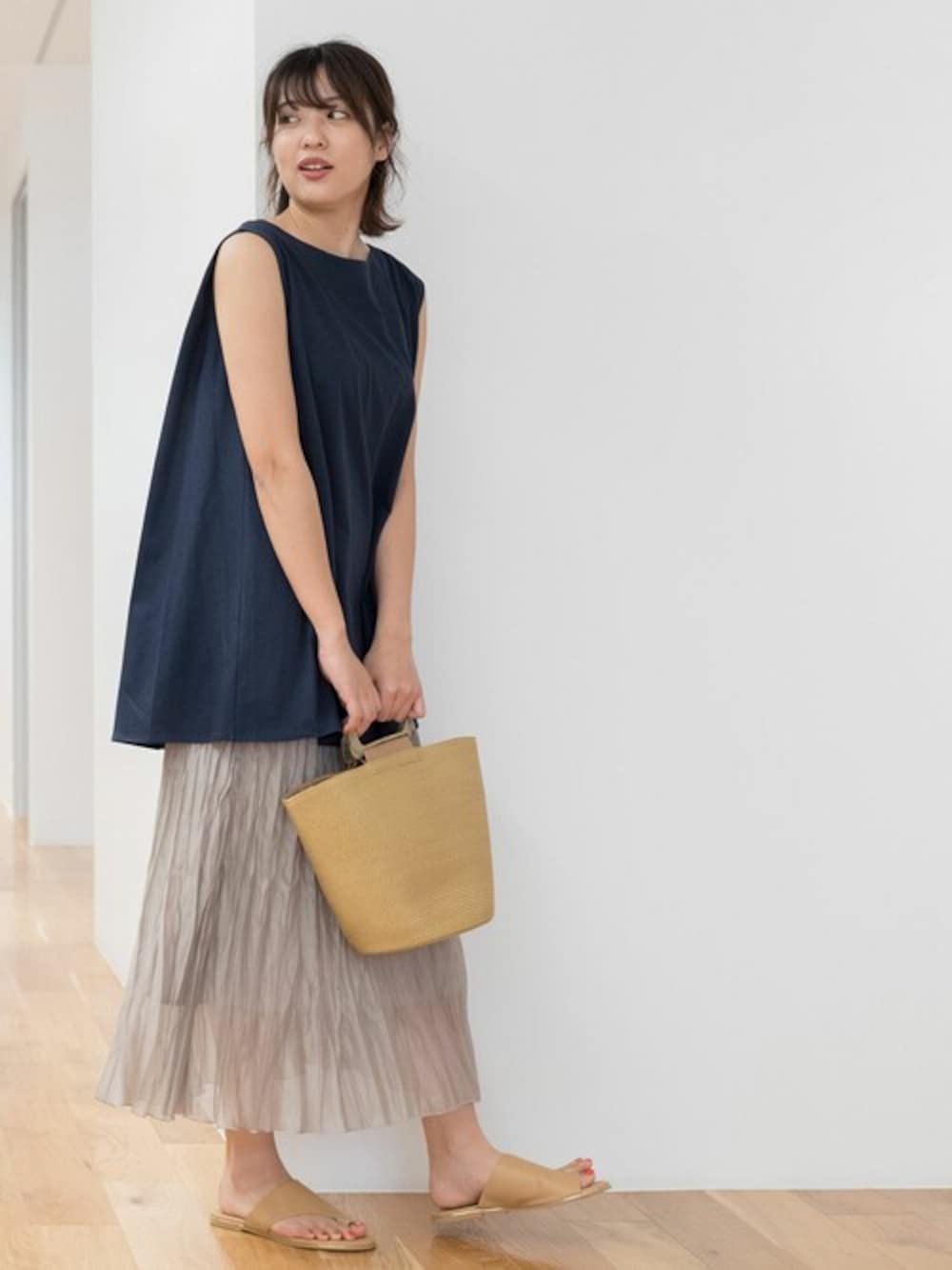 ゆったりシルエットと長め丈で、着るだけでこなれた抜け感がでるチュニック。カジュアルなトップスには甘さのあるプリーツスカートをあわせるのが今の気分♪ランダムなプリーツ加工で表情のあるスカートは初夏の気分にぴったりな1枚。