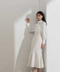 1枚でサマになるブラウスとスカートを合わせた着映えコーデ。春らしいツイード素材のバッグと、ゴールドの華奢なサンダルでフェミニンにまとめました。ブラウスにボリュームがあるので、すっきりとしたシルエットのボトムと合わせるのがおすすめです。スカートのウエスト部分のビットチェーンとフラップデザインが、ウエスト位置を高く見せ、スタイルアップ効果があるのも嬉しいポイント。