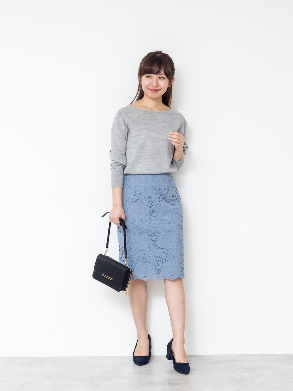上品なコードレースタイトスカートは、グレー×ブルーでフェミニンに着こなします。