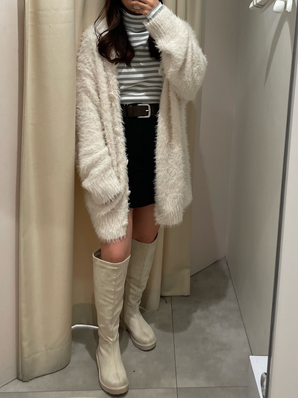べりこのカーディガン/ボレロ「ふわふわ感があざと可愛い。フェザーロングクルーカーディガン」を使ったコーディネート