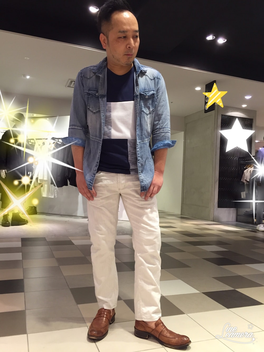 今日のひでさん⭐️ 新作のデニムシャツは夏らしい色で爽やか〜 デニムなのにとても薄くてサラサラした肌触りなのです👍 是非、一度お試しして頂きたいです‼️ アイロンしなくても良いので暑い夏にピッタリです。