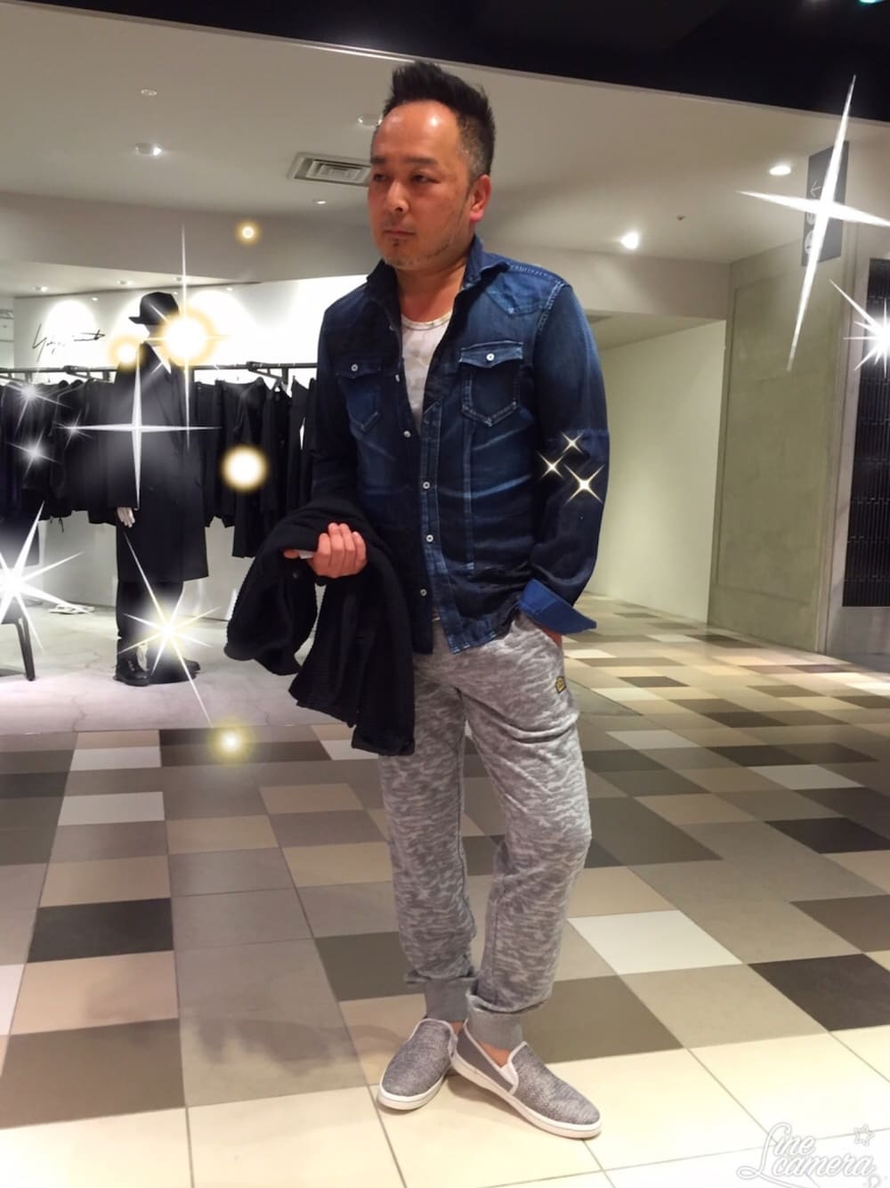 デニムシャツで大人リラックススタイル☆ ジャケット&スリッポンをプラスするとスウェットパンツで合わせてもオシャレに決まります‼️