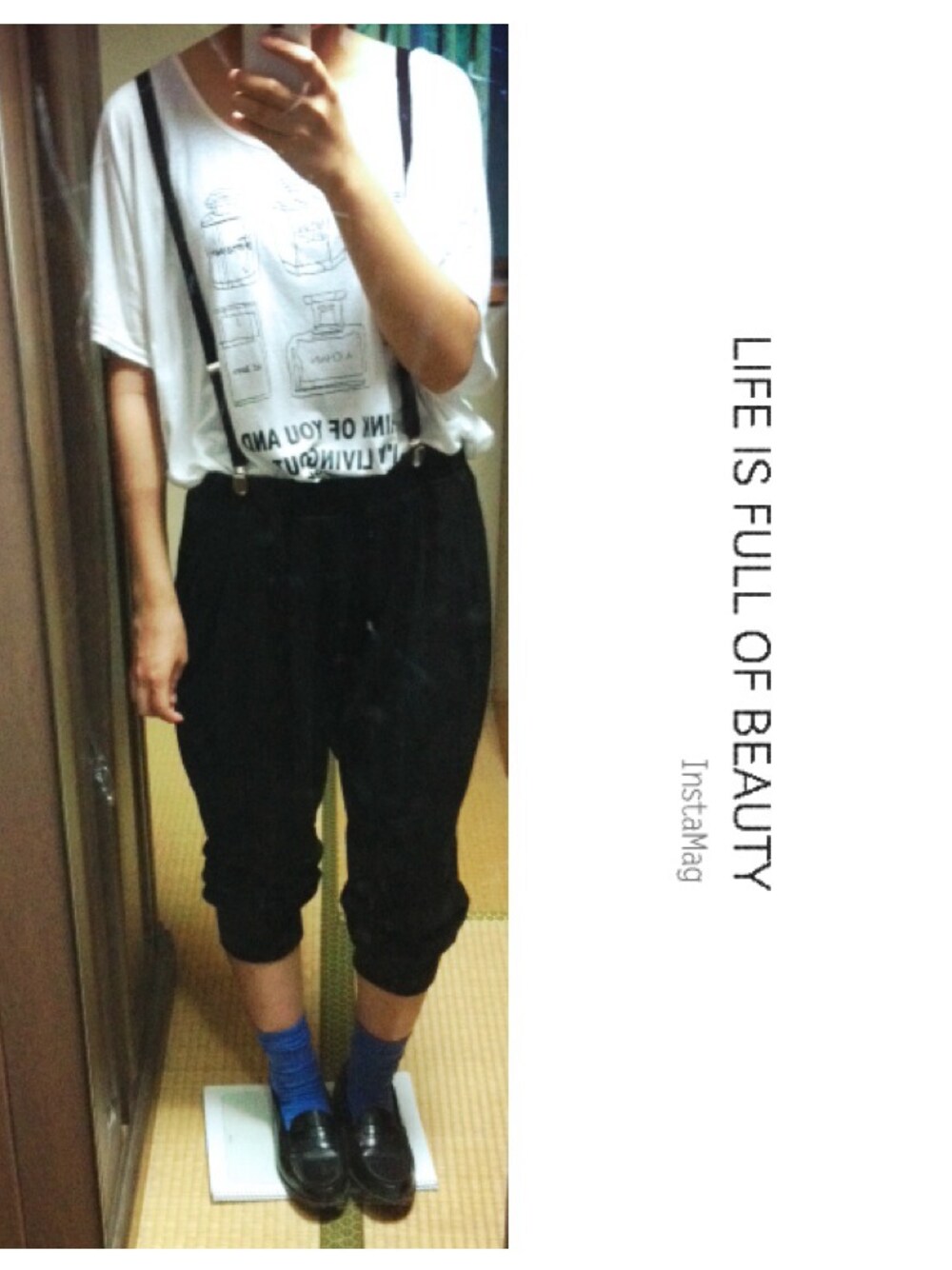 ホワイト系のTシャツ/カットソー、ブラック系のその他パンツを着用したレディースの夏コーディネートの1枚目の写真
